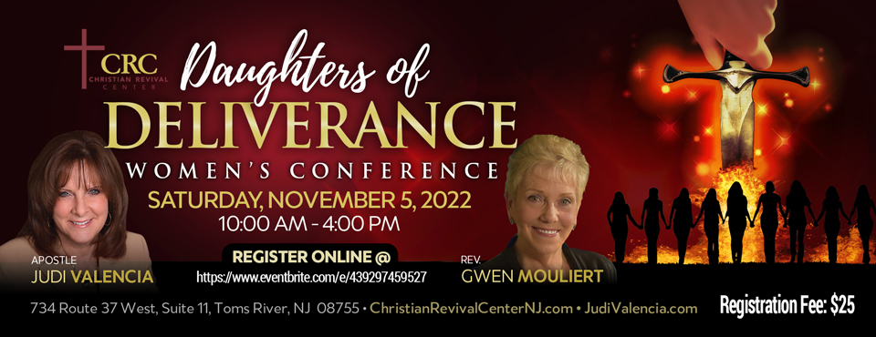 Join Apostle Judi Valencia and guest speaker Gwen Mouliert for the “Daughters of Deliverance Women’s Conference” on November 5, 2022, 10:00am through 4:00pm. The Conference will be held at Christian Revival Center at 734 Route 37 West, Suite 11, Toms River, NJ 08755. For more information, please call at 732-473-0717.
